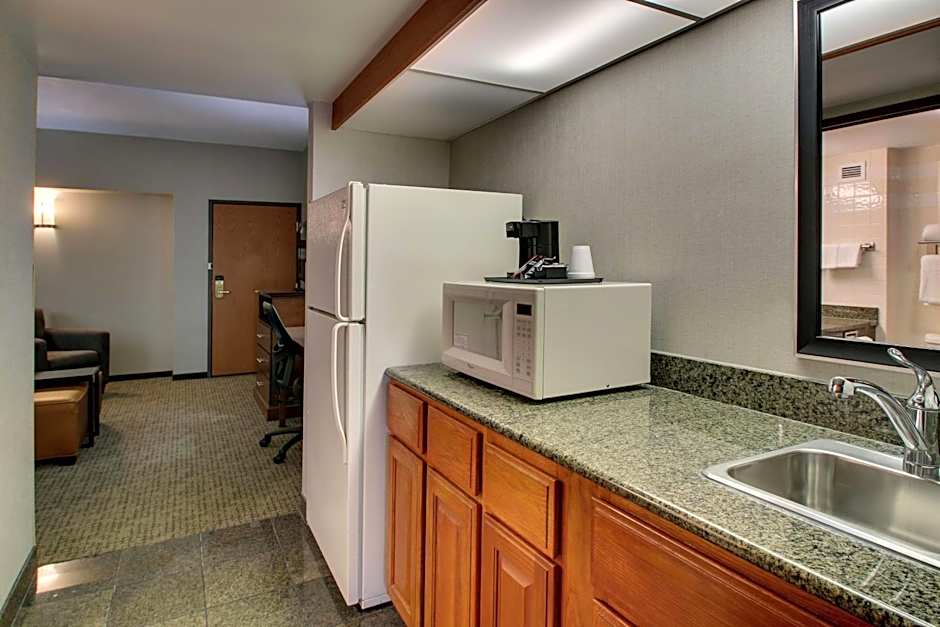 A seating area with a flat-screen TV is featured in this suite. A microwave, and refrigerator are also provided.